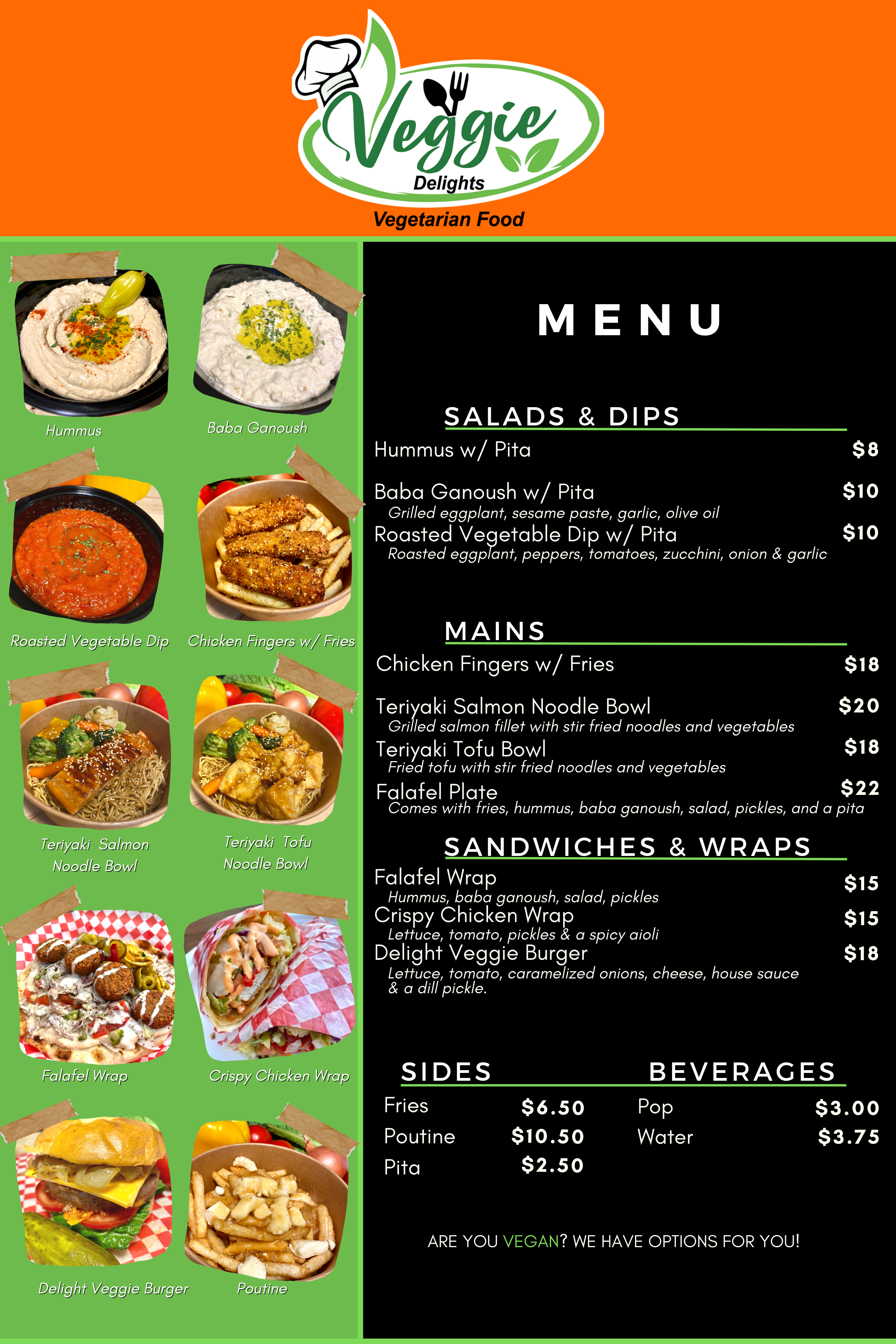 Veggie Delights is here to serve you fresh & tasty, globally inspired vegetarian foods! Whether you need a quick pick me up or are feeling extra hungry... we got you covered!